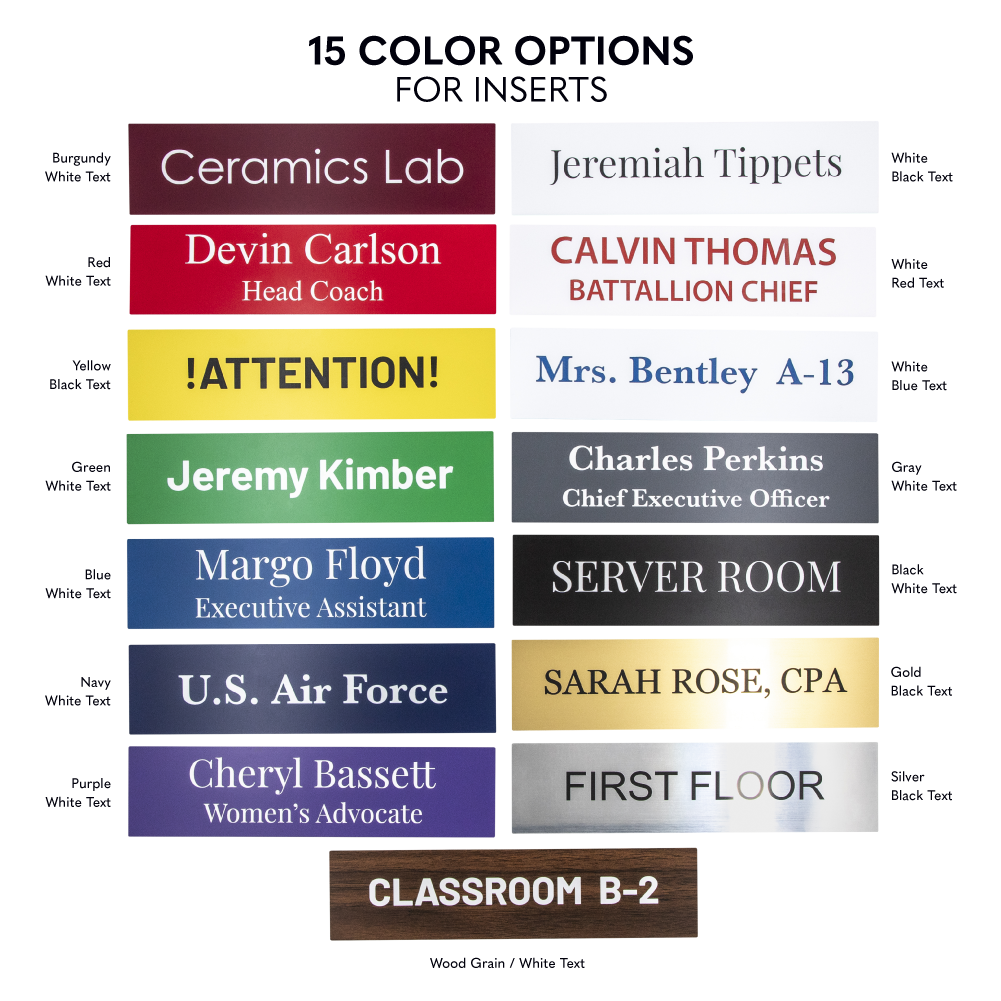 Interchangeable insert system allows easy updates to names, titles, or messages for business offices and workspaces