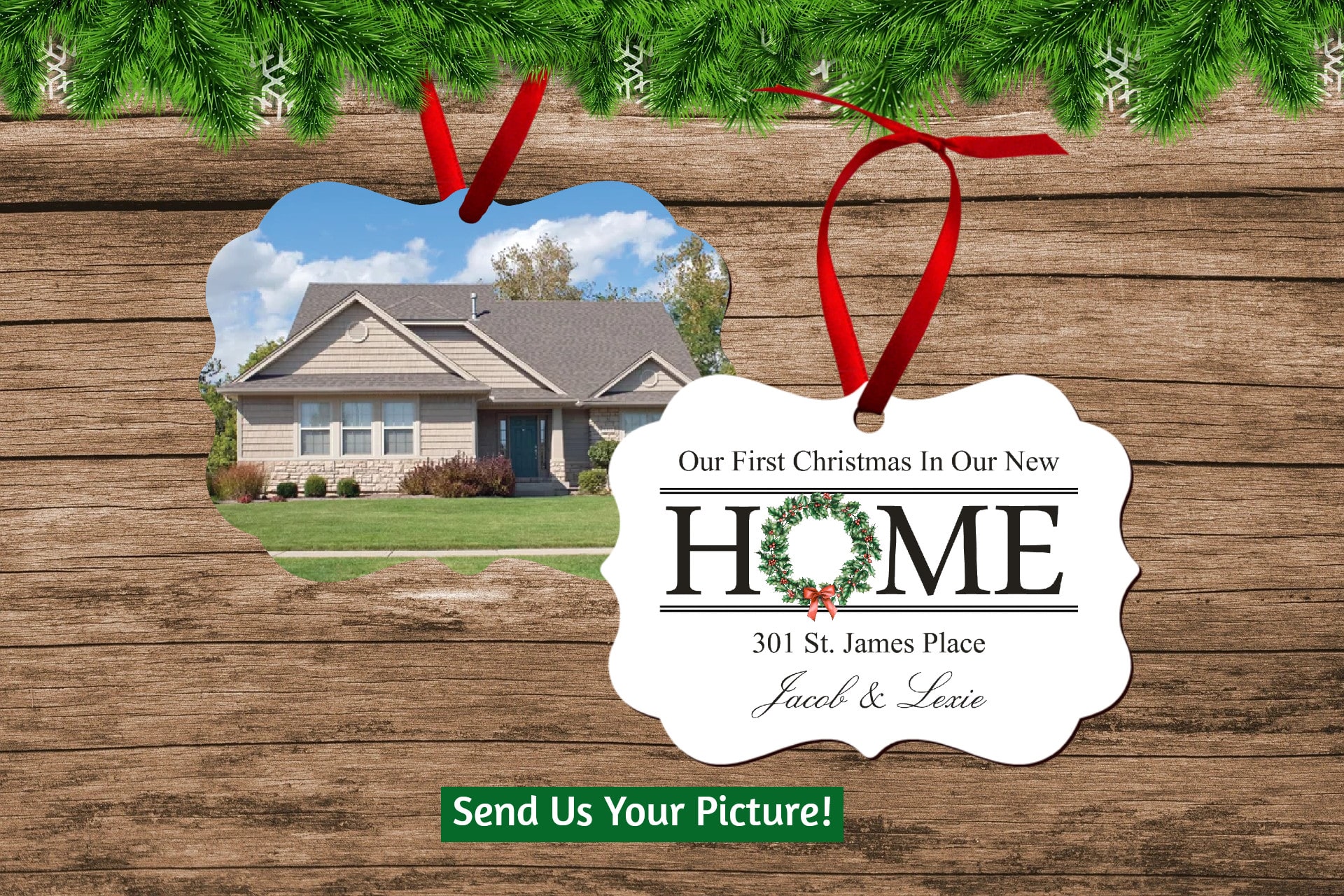 Celebrate your first Christmas in your new home with this custom Christmas ornament personalized with your names, address and year! Upload your home photo to make this a truly personalized Christmas ornament.