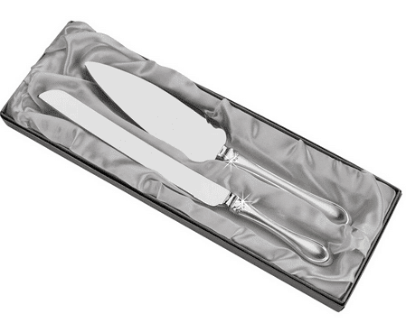 The elegant and sleek design of this wedding knife and server set with crystals is great for any wedding. The crystals near the top of the handle shine and sparkle. The set looks good in an elegant setting as well as a rustic one. The set comes with free engraving and is individually boxed in an equally elegant gift box.
